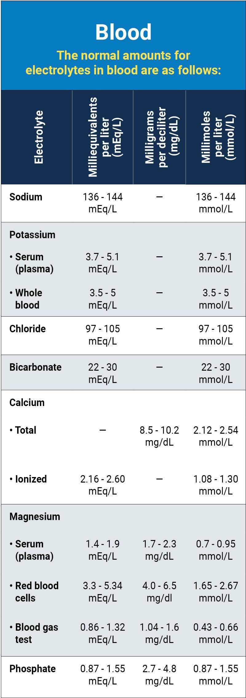 This infographic lists the normal (typical) ranges for each electrolyte in your blood.