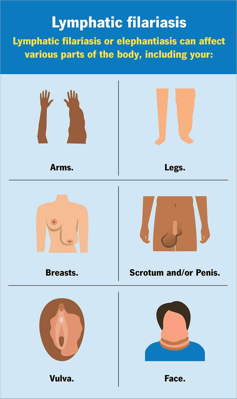 Another name for elephantiasis is lymphatic filariasis (pronounced “fil-ur-AI-uh-suhs”).