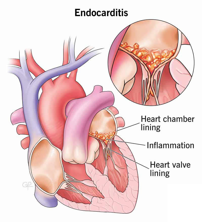 Endocarditis, most often caused by a bacterial infection, inflames the lining of your heart valves and chambers. Symptoms can include chest pain, heart murmur and fast heart rate. Treatment includes several weeks of antibiotics and sometimes surgery. With quick, aggressive treatment, many people survive. Without treatment, endocarditis can be fatal.