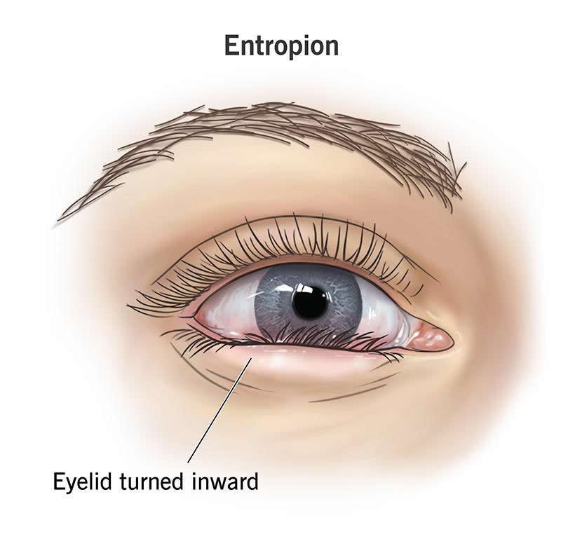 Entropion is a condition where your eyelid turns in toward your eye. As a result, your eyelashes and skin rub against your eyeball, causing discomfort to your cornea (the front part of your eye). Entropion is common in adults over the age of 60. You can treat it in several ways, including soft contact lenses, Botox® injections or surgery.