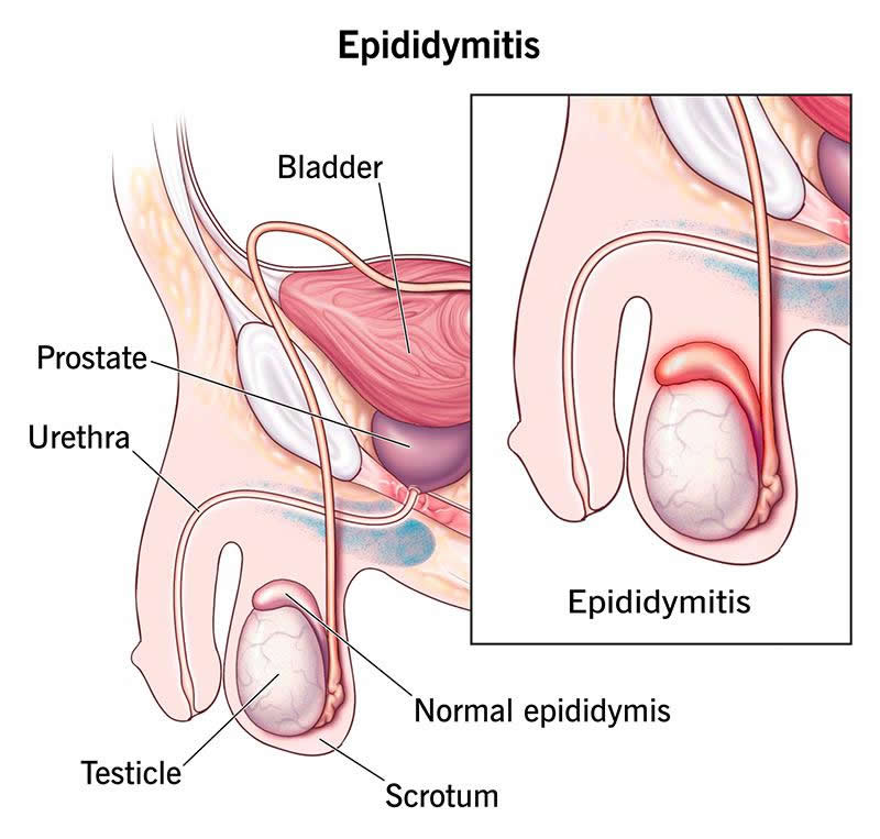 Epididymitis (up-uh-DID-uh-MI-tis) is inflammation of your epididymis (ep-uh-DID-uh-miss) that causes discomfort or pain in your scrotum, testicle or epididymis. Your epididymis is a coiled tube at the back of your testicle — most people have one behind each testicle (plural epididymides). It stores and carries sperm.