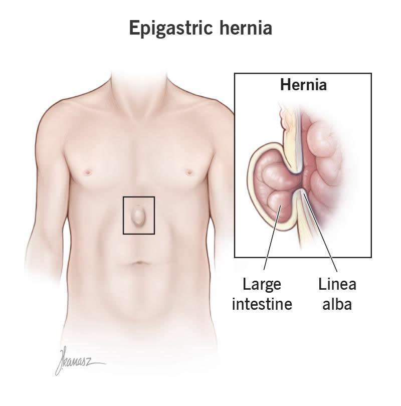 Epigastric (eh-puh-GA-struhk) hernias develop in the upper middle area of your belly (abdomen). They appear in the space below your breastbone and above your belly button. They’re a common type of ventral hernia (a hernia in your front abdominal wall). You can have more than one epigastric hernia.