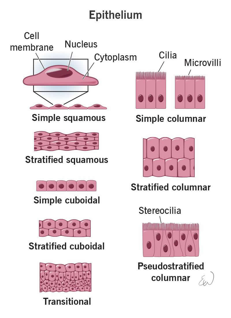 Given the different shapes and types of layers of epithelial cells, there can be several types of epithelial tissue, including: