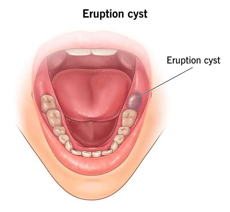 An eruption cyst forms when fluid gets trapped between an emerging tooth and its protective sac (called the dental follicle). Experts aren’t sure why it happens, but they think it could have something to do with minor trauma or inflammation during tooth development.