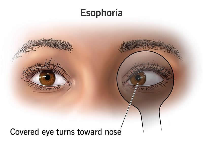 Esophoria is when covering one of your eyes makes it misalign and turn toward your nose. It’s a type of phoria, which is an eye misalignment that happens to an eye when you cover it. Larger phorias, including esophoria, are symptoms that fall under strabismus.