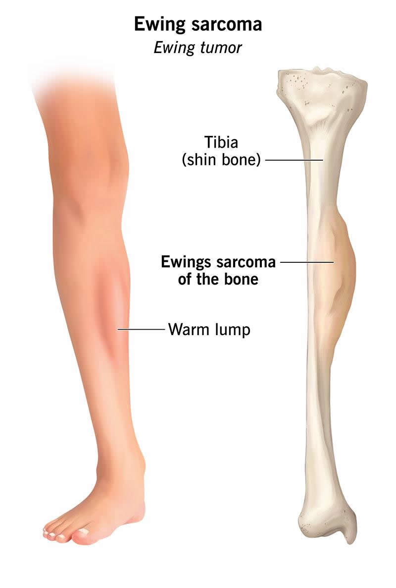 Ewing sarcoma is a group of rare cancerous tumors in your bones or your soft tissues. The conditions typically affect people age 10 to 20. Symptoms are bone pain, swollen areas on your bones or lumps that feel warm to the touch. Treatment is chemotherapy followed by surgery to remove the tumors.