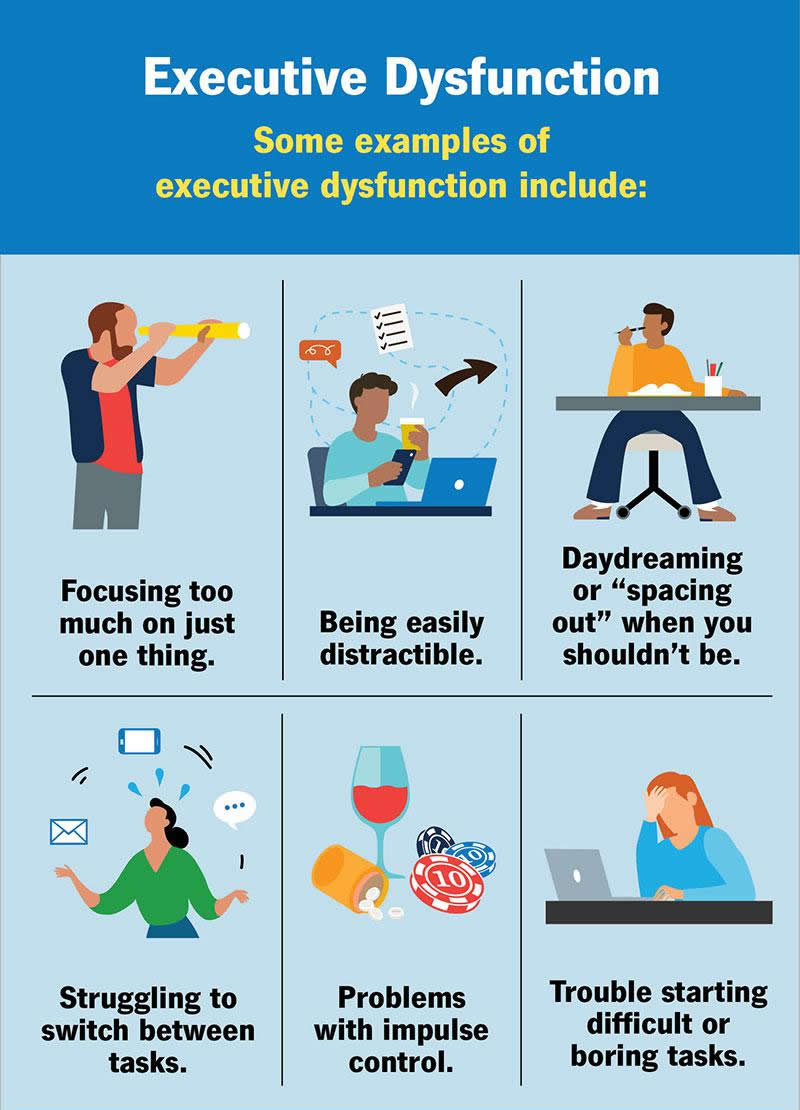 Because executive functions involve so many processes inside of your brain, executive dysfunction can take many forms. Some examples of executive dysfunction include: