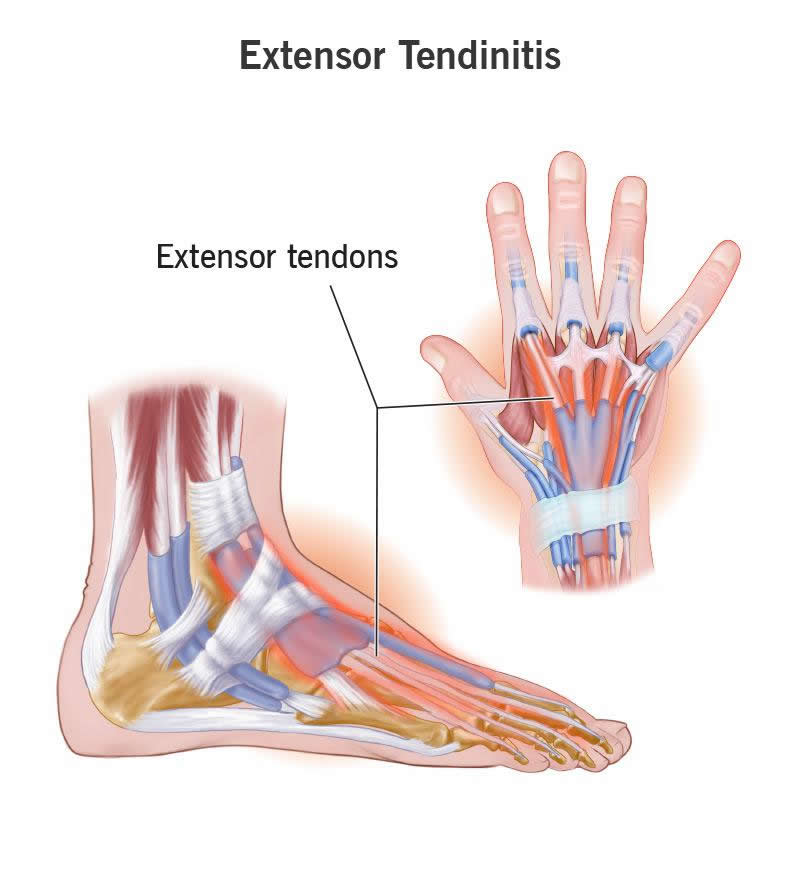 If you have extensor tendinitis, one of the extensor tendons that run along the top of your foot or back of your hand just below your skin is irritated or inflamed.
