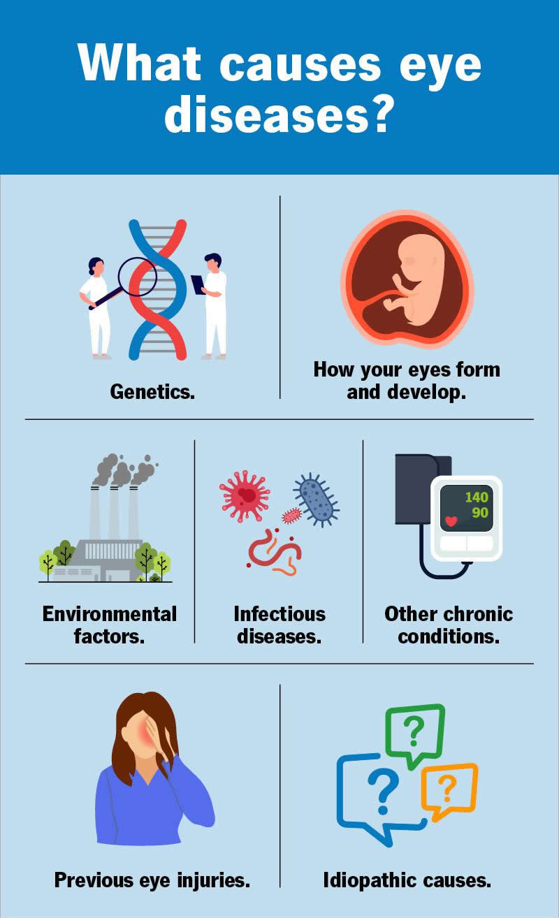 Eye diseases can happen for many, many reasons. Some are direct causes while others are contributing or risk factors.