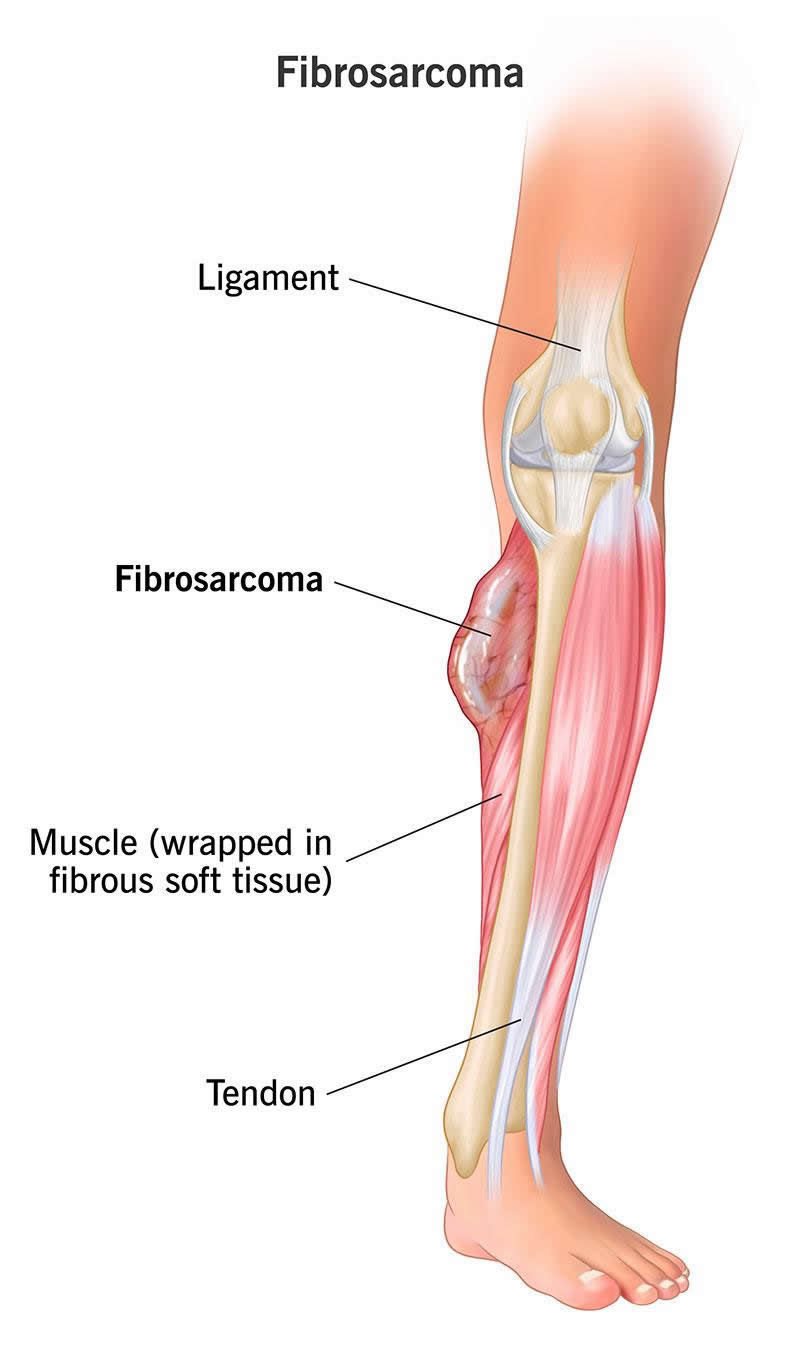 Fibrosarcoma most often forms in soft tissue deep inside your leg (especially your shin bone or thigh bone), upper arm, knees or trunk. Less often, they start in your head or neck.