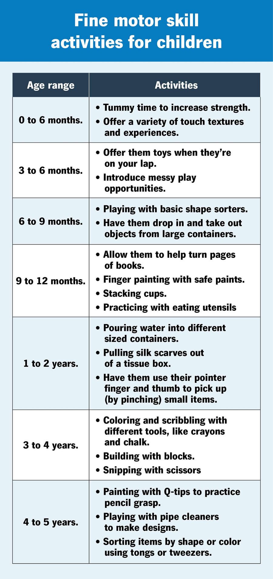 Fine motor skills continue to develop and strengthen after these ages. It’s important to remember that each child develops at their own pace. If you’re concerned about your child’s fine motor milestones, talk to their healthcare provider.