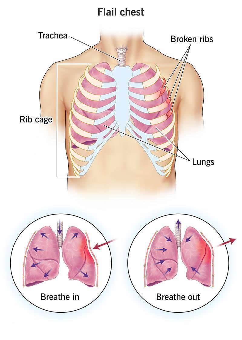 Flail chest is a traumatic disorder that happens when three or more ribs located next to each other are fractured in two or more places. This causes your chest wall to become unstable, interfering with breathing.