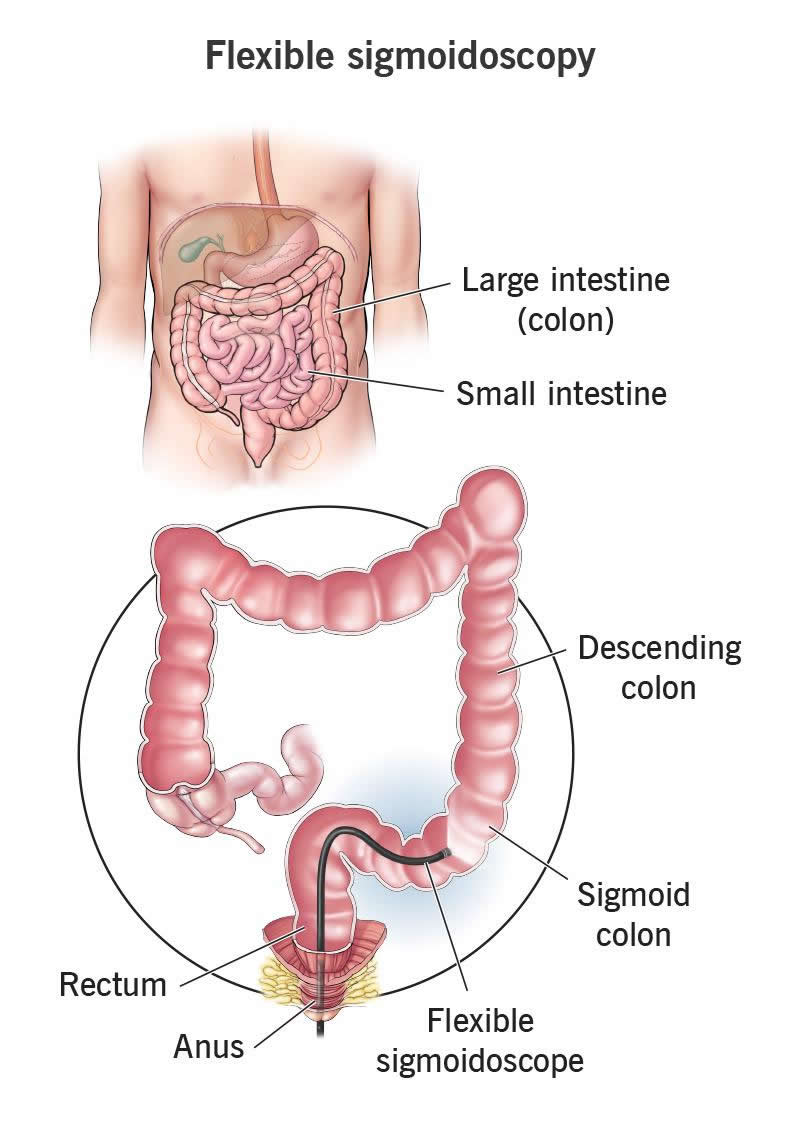 A flexible sigmoidoscopy is like a partial colonoscopy. It examines only the lower third of your large intestine. Your provider might suggest this procedure if you have unexplained symptoms related to your lower colon, rectum and anus.
