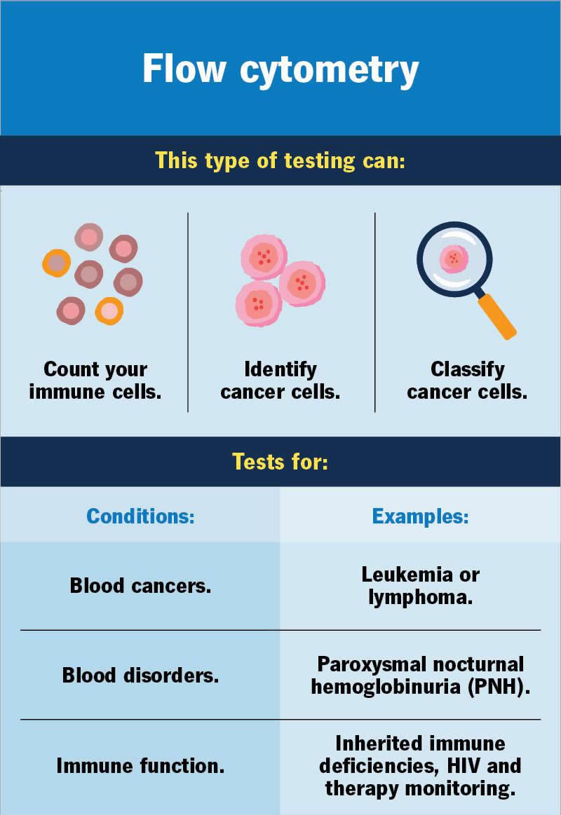 Flow cytometry is a laser-based lab test that can detect chemical and physical differences of cells or particles. Healthcare providers commonly use it to evaluate bone marrow, peripheral blood and other fluids in your body. Flow cytometry can help diagnose several conditions, including infectious diseases and cancer.