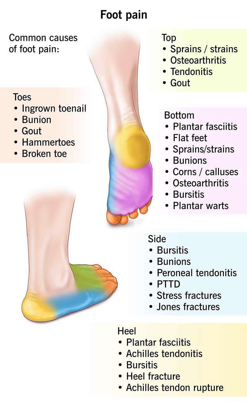 - Plantar fasciitis (commonly causes arch and heel pain).