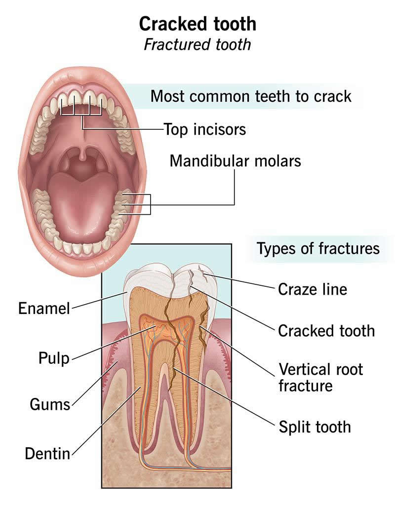 A cracked tooth is when something damages your tooth and causes a small break (crack or fracture) in it. The crack may be small enough that it doesn’t affect your tooth. Other times, your tooth may break in pieces or split. A badly cracked tooth may be a dental emergency.