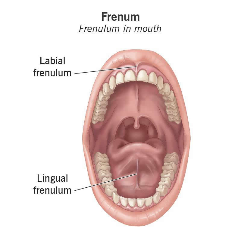 Most people have several oral frenums. The most prominent ones are the: