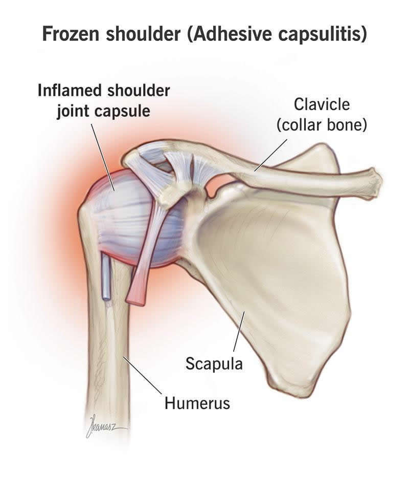 Frozen shoulder, also called adhesive capsulitis, is a condition involving pain and stiffness in your shoulder joint. Symptoms usually start slowly and get worse over time. But within one to three years symptoms typically get better. Your risk for developing frozen shoulder increases if you must keep your shoulder still for a long time.