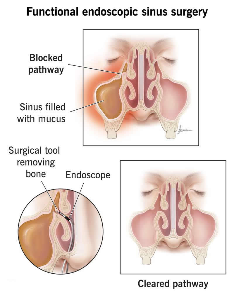 Functional endoscopic sinus surgery (FESS) is minimally invasive surgery for serious sinus conditions. It’s mostly used to treat chronic sinusitis and nasal polyps. Healthcare providers use nasal endoscopes to operate inside your nostrils, so there are no incisions in or around your nose. Most people who get it notice major symptom improvements.
