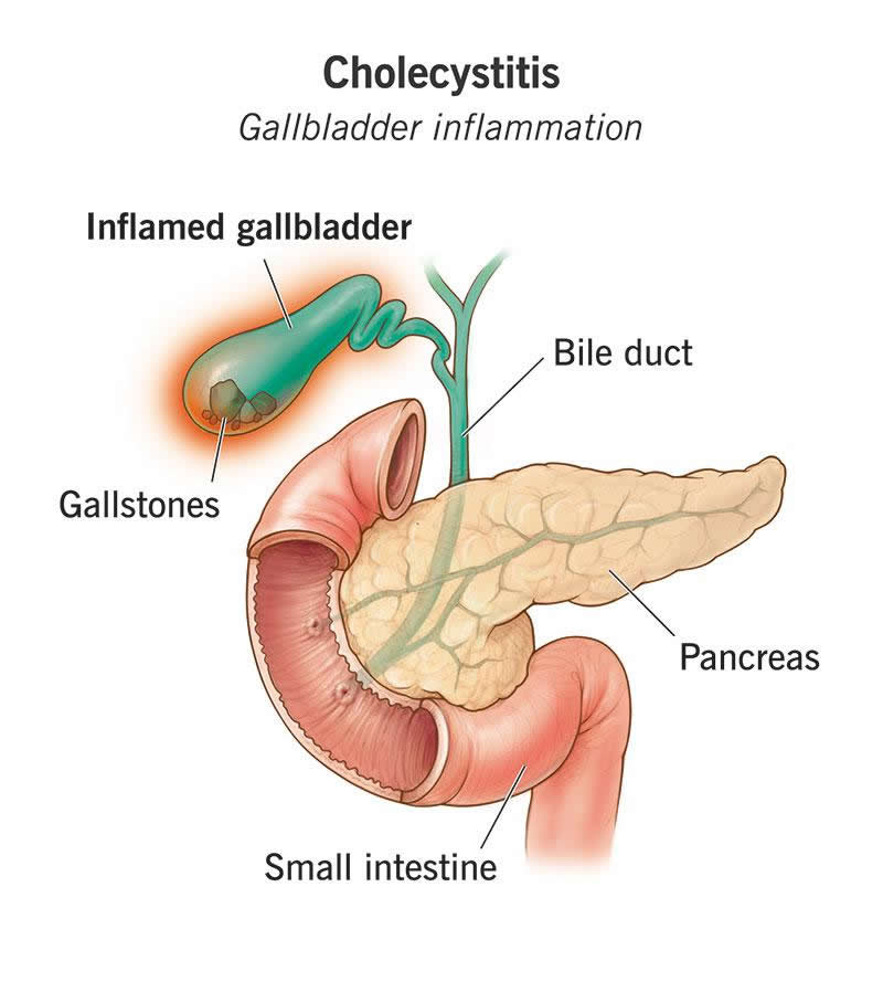 Cholecystitis (KO-leh-sis-TY-tiss) is inflammation in your gallbladder, the small, pear-shaped organ that lives under your liver and stores the bile your liver makes. Your gallbladder sends bile to your small intestine after you eat to help digest fats. It sends and receives bile through tiny pipelines called bile ducts. An infection or obstruction in your gallbladder or the bile ducts connected to it can cause inflammation, pain and swelling inside it.