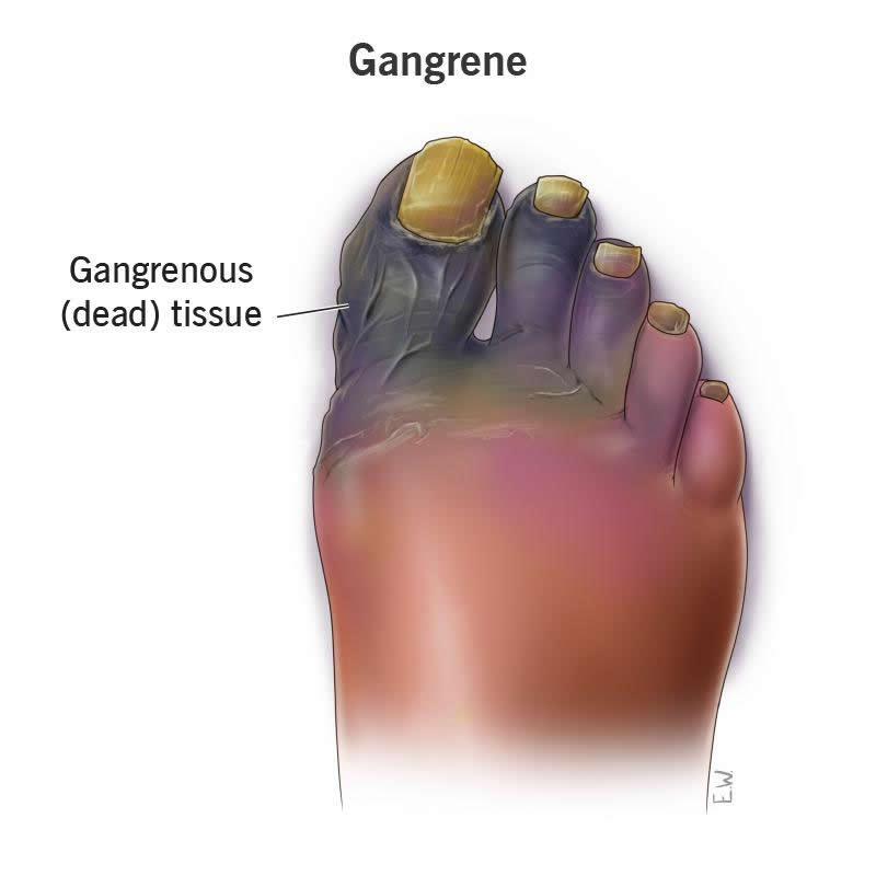 Gangrene is when lack of blood flow causes tissues in your body to die. It often starts on the edges of limbs, like toes or fingers. But it can form anywhere blood’s not reaching. Gangrene looks like a patch of discolored skin (red, brown, purple, green, black). The area may have blisters that leak blood or pus. Prompt treatment is lifesaving.