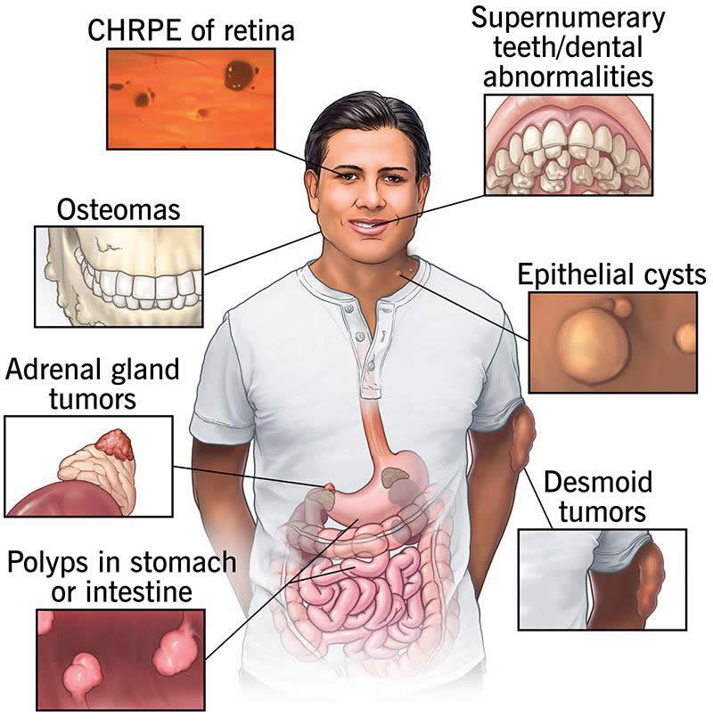 Gardner syndrome is a rare inherited condition that may affect you in many different ways. Gardner syndrome causes many symptoms, from having extra teeth and noncancerous bone tumors to developing hundreds of colon polyps that become colon cancer. People with Gardner syndrome have an increased risk of other cancers. If genetic tests show you have Gardner syndrome, you’ll need regular screening tests to catch cancer and other issues early on. If you have many colon polyps from Gardner syndrome, you may need surgery that can eliminate the risk of colon cancer but may also affect your lifestyle. Your healthcare providers may not be able to predict all the ways that Gardner syndrome may change your life. But they can recommend screening tests to catch issues early on and treatments to reduce your risk of serious illness and support you throughout.
