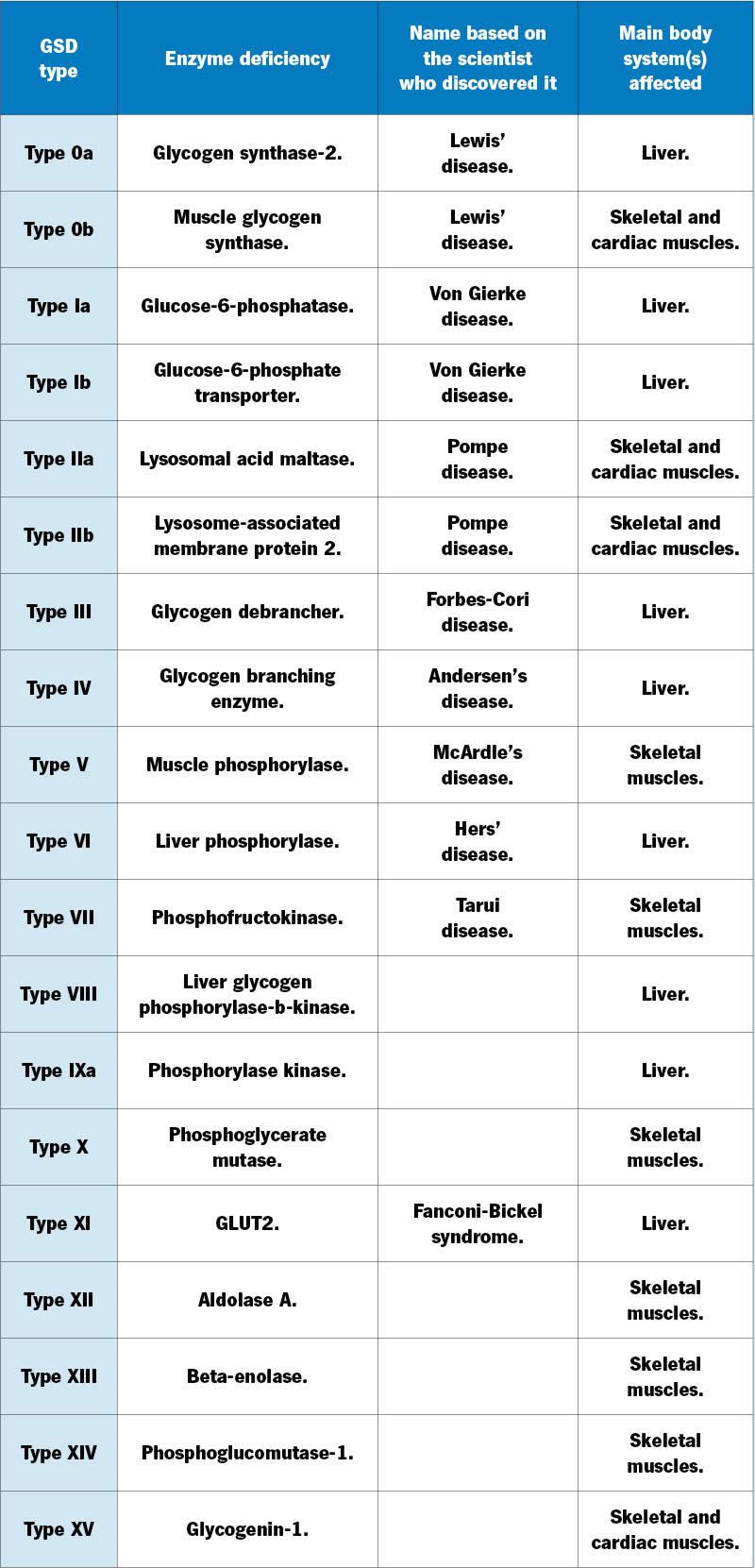 For each type of GSD, there’s a lack (deficiency) of a certain enzyme involved in glycogen storage or breakdown. Healthcare providers may refer to each type based on the specific enzyme that’s missing or the scientist who discovered that type of GSD.