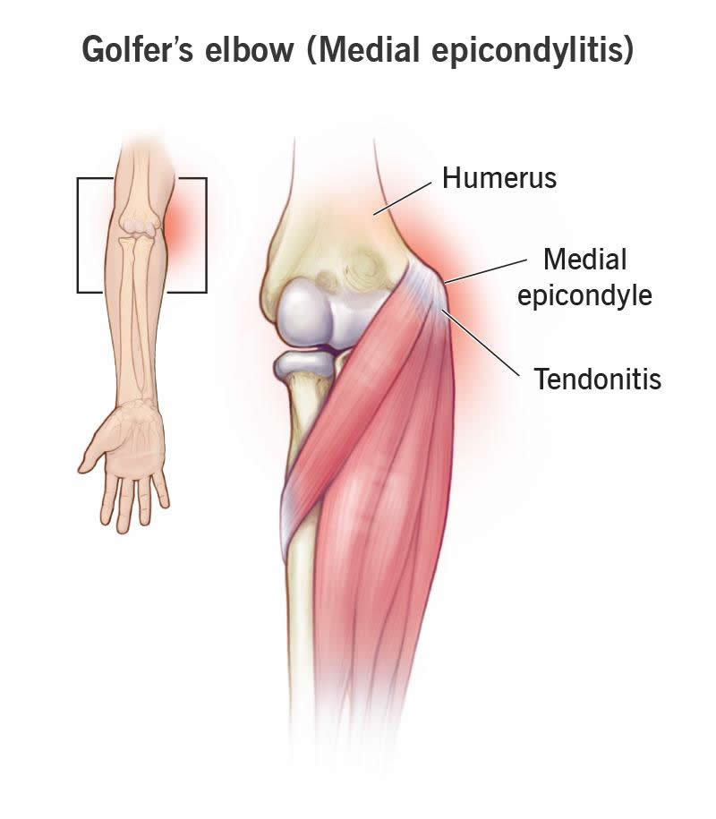Golfer’s elbow (medial epicondylitis) happens when you repeatedly use your wrist and arm to bend, grasp or twist things. Over time, the tendons that connect your forearm and elbow develop strains that lead to tiny tears, which can cause elbow, forearm and wrist pain.