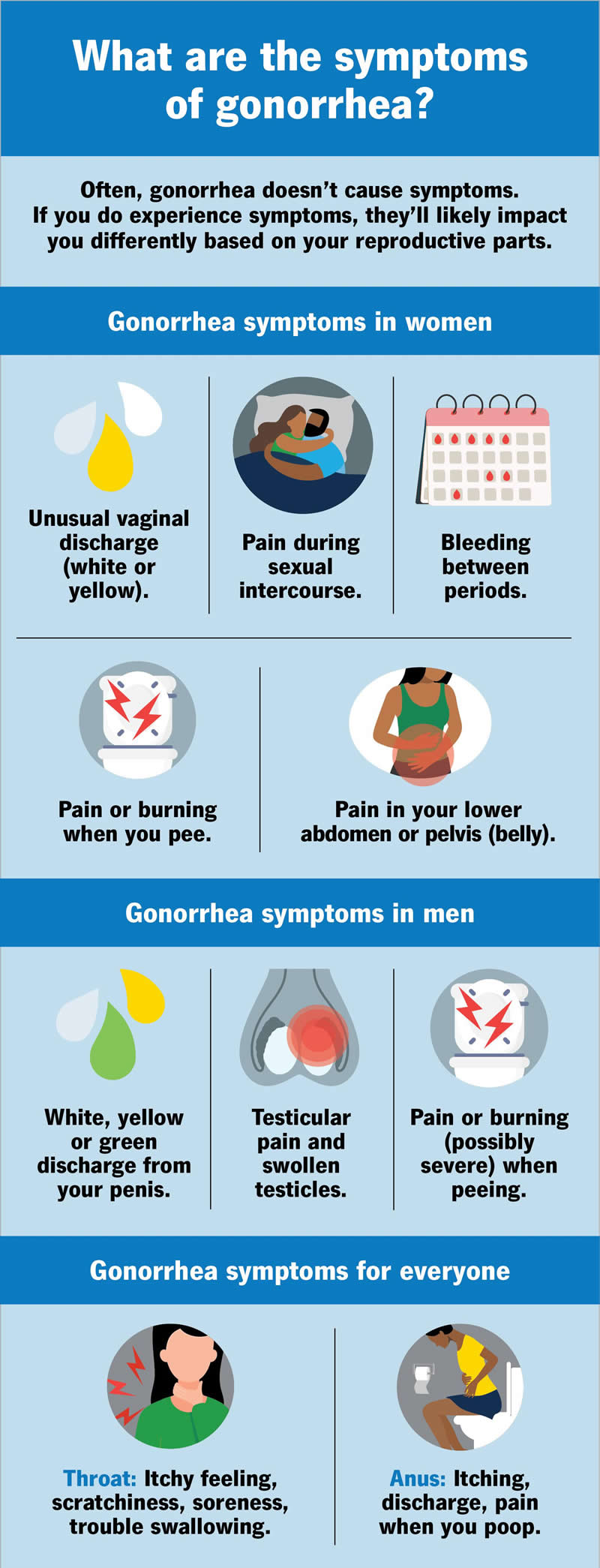Gonorrhea, or “the clap,” is a sexually transmitted infection (STI). Often, gonorrhea doesn’t cause symptoms, especially in women. When present, symptoms differ based on your reproductive parts. See your healthcare provider if you think you’re infected. Prompt treatment with antibiotics can prevent long-term problems.