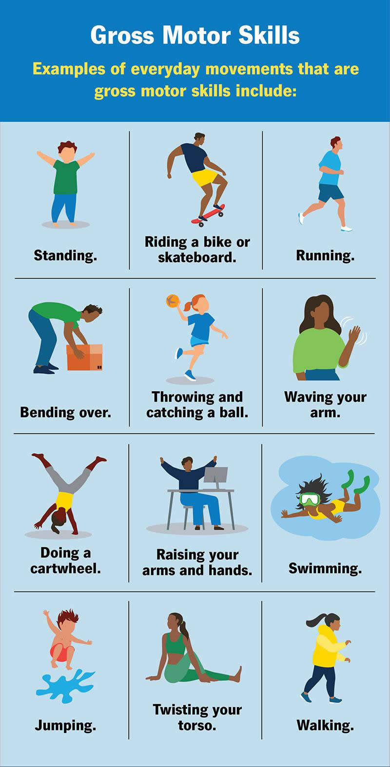 Gross motor skills are the large, sweeping movements we make with arms, legs and torso. We develop these skills from birth to adolescence. Healthcare providers have benchmarks — or milestones — for different gross motor skills at different age ranges. Talk to your child’s provider about what you should expect at different age levels.