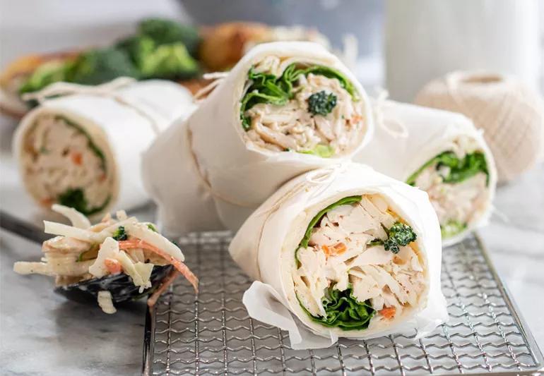 When you make wraps, it’s best to use fresh vs. processed meats. Try this delicious lunch, featuring shredded chicken (use a rotisserie chicken to save time).