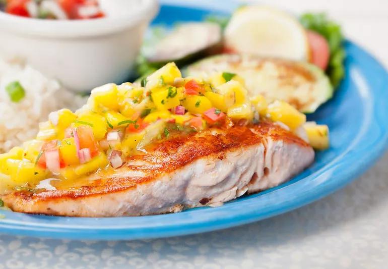 Give your grill a break from the ol’ burgers-and-dogs routine. This recipe for salmon with mango salsa is perfect for outdoor cooking and grills up in just a few minutes. Salmon, with its essential fatty acid omega-3s, is a great choice for heart health. And paired with the zippiness of mango salsa, it’s sure to be a summer sensation.