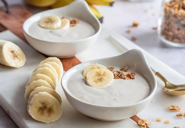 Bananas are high in potassium and easy to digest, but they also carry other health benefits, too. When paired with Greek yogurt, this dessert is packed with protein but has zero saturated fat for a creamy, sweet finish.