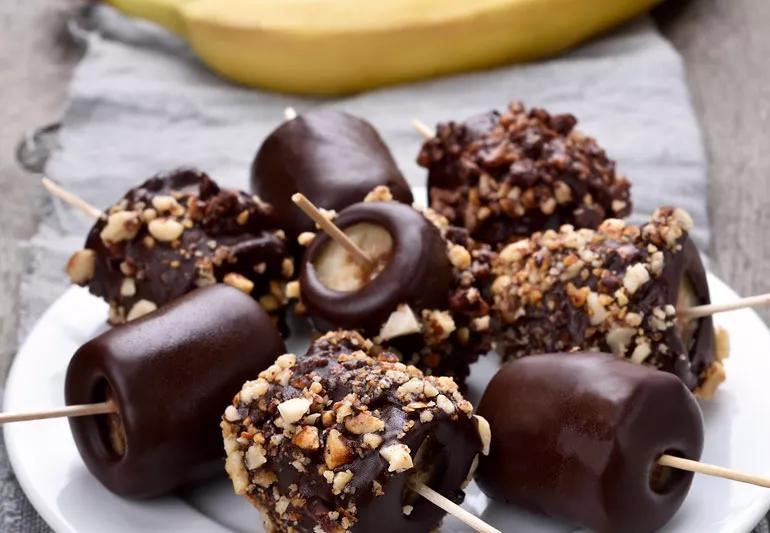 This is perhaps a perfect blend of ingredients from the first two recipes on this list. Using dark chocolate with 70% cocoa, these sweet treats pack a midday energetic punch. For extra protein, you can roll each chocolate-covered banana in assorted nuts.