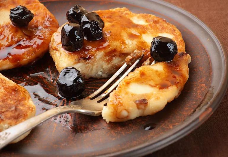 Cottage cheese pancakes with maple syrup-sweetened berries
