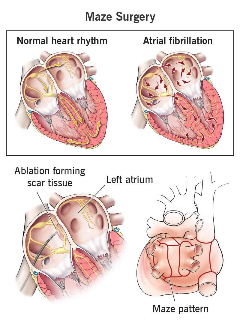 A maze procedure treats atrial fibrillation (AF or AFib), which is the most common abnormal heart rhythm. Atrial fibrillation is an irregular, frequently rapid heart rhythm that starts in the atria (top chambers of your heart).