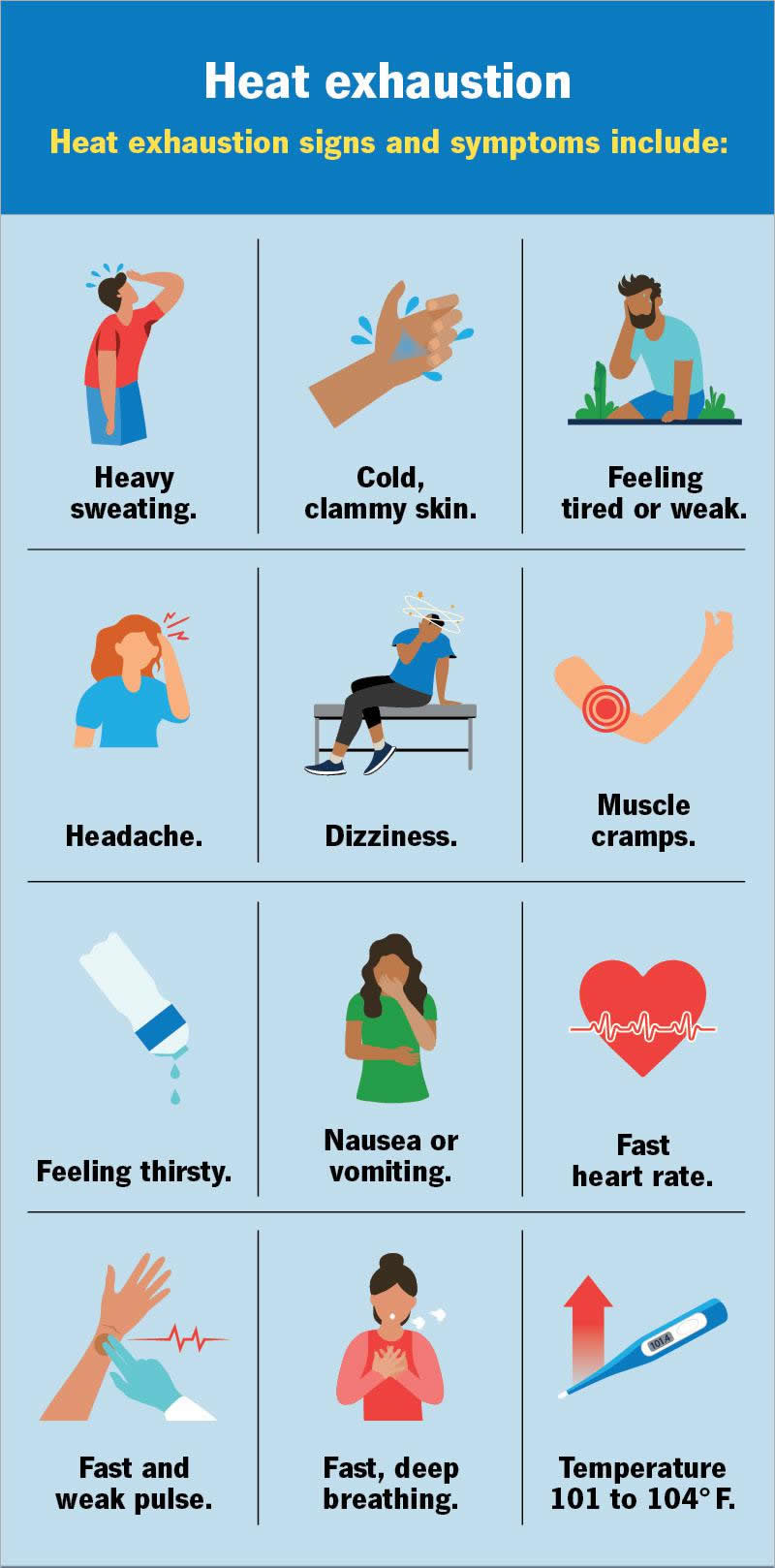 Heat exhaustion can occur when you exert yourself, especially in hot weather. Symptoms include heavy sweating, headache, dizziness, nausea and fast heart rate. Immediately stop what you’re doing and move to a cooler area. Cool your body and seek medical care. Untreated heat exhaustion can progress to life-threatening heat stroke.