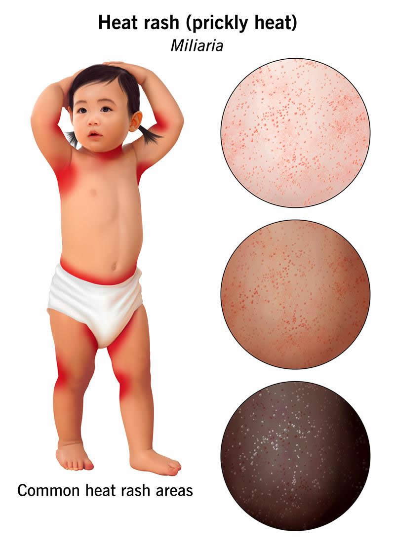 Heat rash often develops on areas of your body that don’t get enough airflow (for example, areas covered with clothing). It also tends to form in folds and creases where there’s skin-to-skin contact.