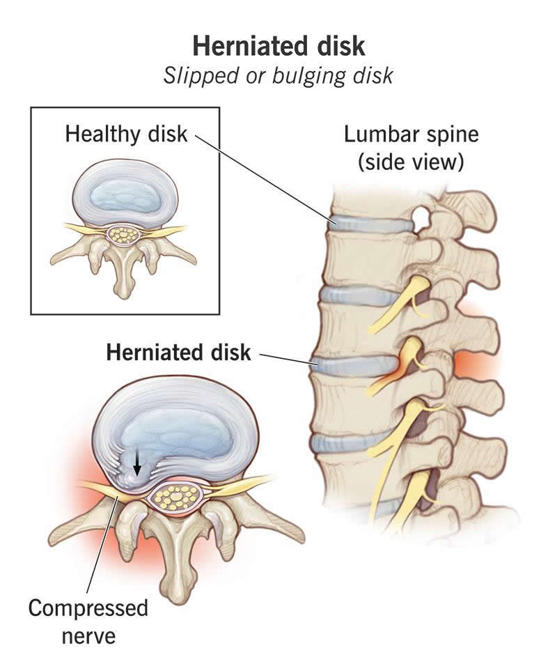 A herniated (slipped or bulging) disk occurs when the soft, jelly-like center of a disk in your spine pushes against and leaks out of its outer ring. This can lead to pain, numbness and weakness in your neck, back or legs. Herniated disks usually heal on their own within four to six weeks. If symptoms persist, see a healthcare provider.