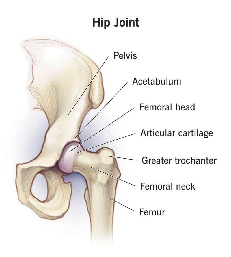 Your hips are ball-and-socket joints. A rounded ball at the top of your thigh bone fits into a socket in your pelvis. They get their medical name from this connection. This socket is the acetabulum. And your thigh bone is your femur. So, the medical term for the hip joint is the acetabulofemoral joint.