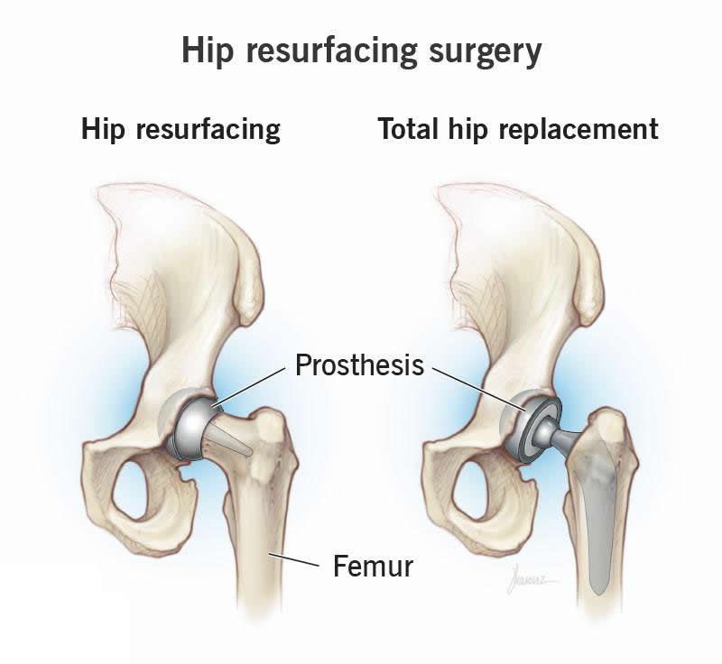 Hip resurfacing surgery is an alternative to a total hip replacement for some people who have severe hip pain and stiffness. Instead of replacing your whole hip joint, your surgeon replaces your hip socket (acetabulum), and then surgically re-shapes the top of your thigh bone (femur) to fit securely into the prosthetic.