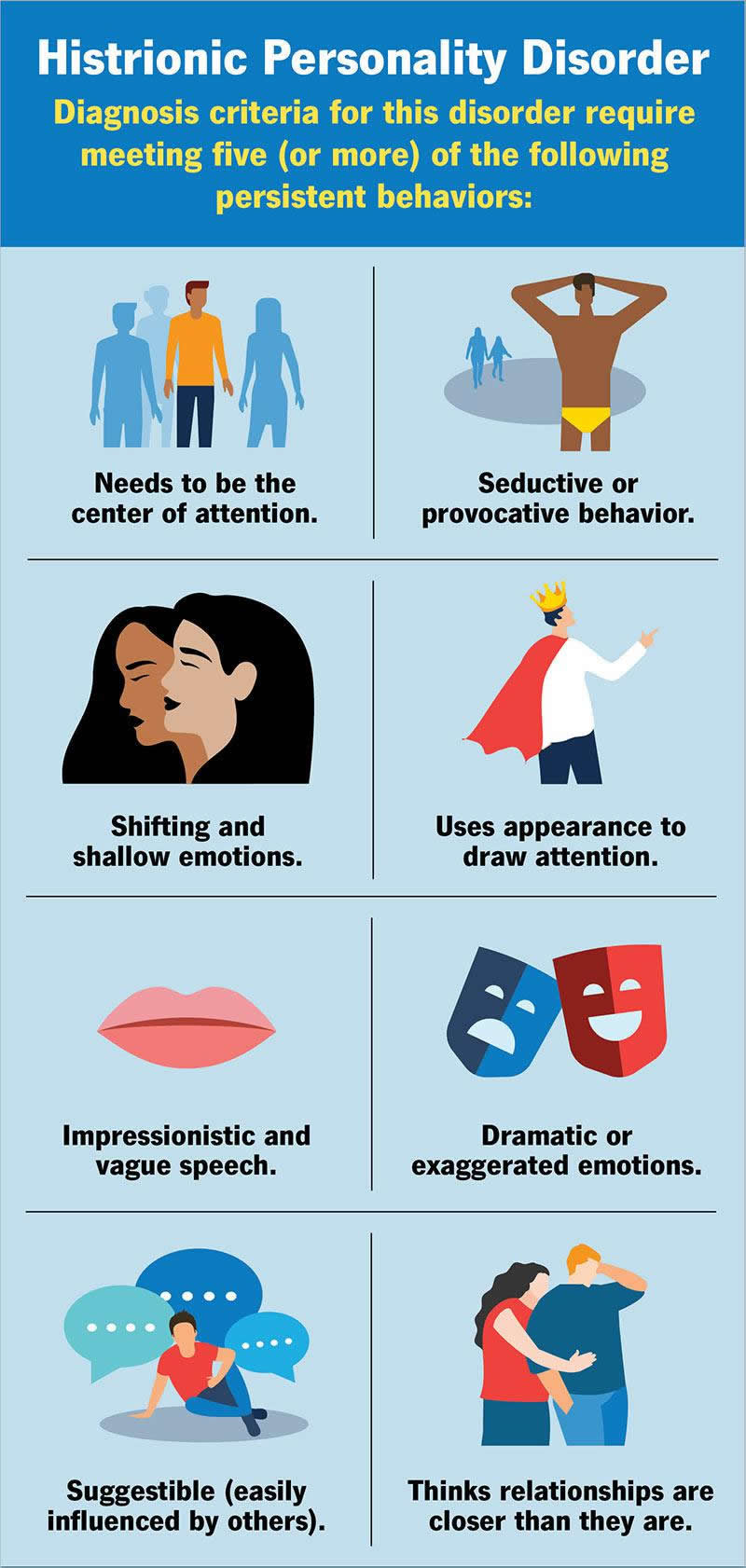 Mental health providers base a diagnosis of histrionic personality disorder on the criteria for the condition in the American Psychiatric Association’s Diagnostic and Statistical Manual of Mental Disorders.