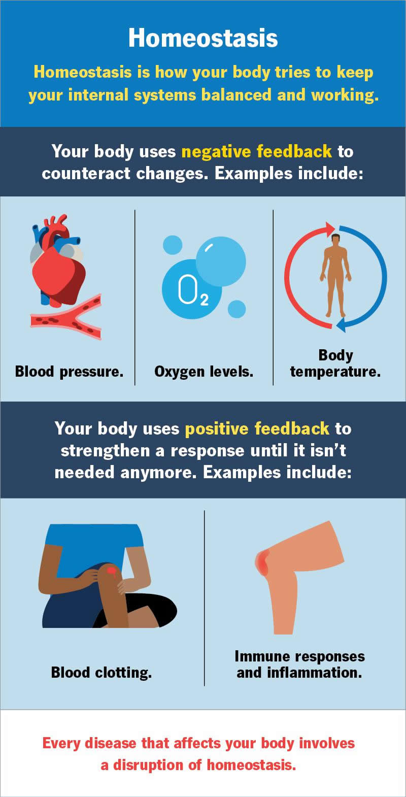 Homeostasis is how your body regulates your internal systems so they function correctly. Your body works best when its internal environment — including things like temperature or oxygen levels — is just right.
