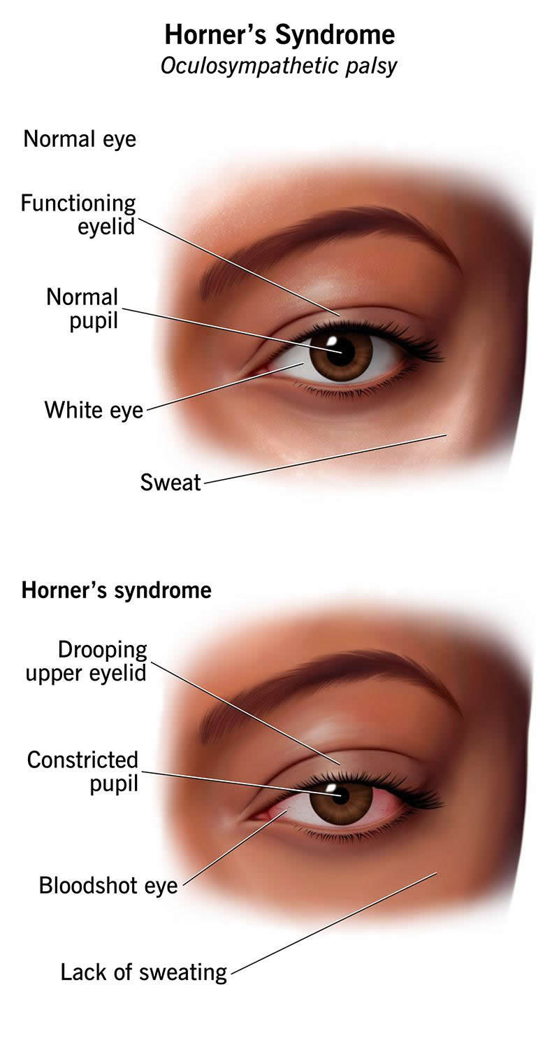 If you have symptoms of Horner syndrome, such as one drooping upper eyelid, mismatched pupil sizes and lack of sweating on the same side of your face, see a healthcare provider as soon as possible.