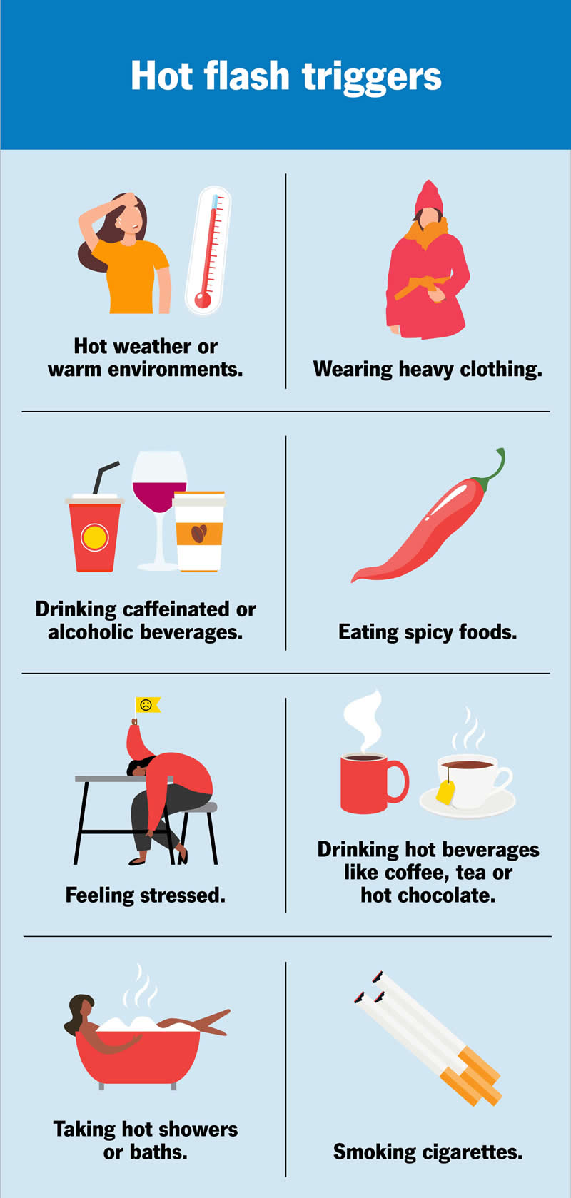 A trigger is something that can set off a hot flash. Common triggers of hot flashes can include: