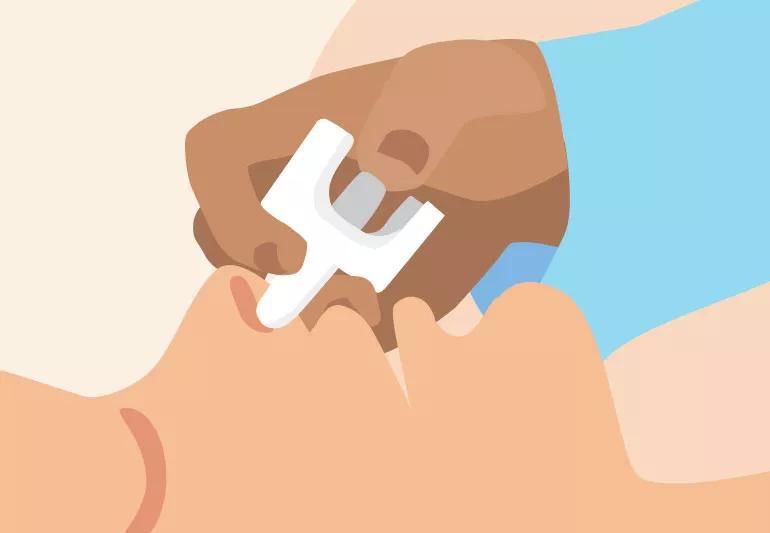 - Tilt the person’s head back, and insert the nozzle into one nostril until both your pointer and middle fingers touch the bottom of the person’s nose.