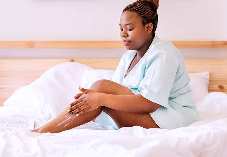 Just sprinkle some colloidal oatmeal into your bathwater to help soothe itchy legs and restore some moisture. When you get out of the tub, pat yourself dry (rubbing can make things worse) and apply a fragrance-free moisturizer.