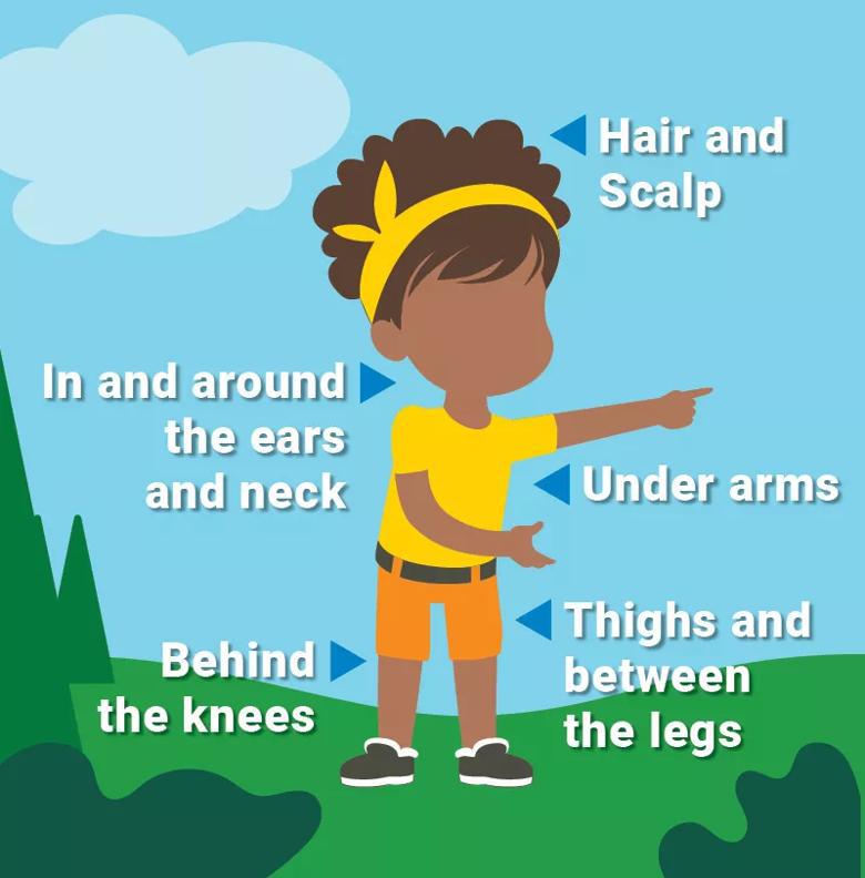 Once your child comes in from outside, examine their skin from head to toe, including those hard-to-reach places like in and around their ears, between their thighs and legs, and along their hairline.
