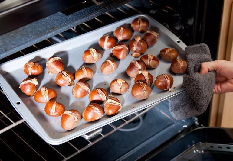 - Put the chestnuts in a baking pan with the “X” facing up.