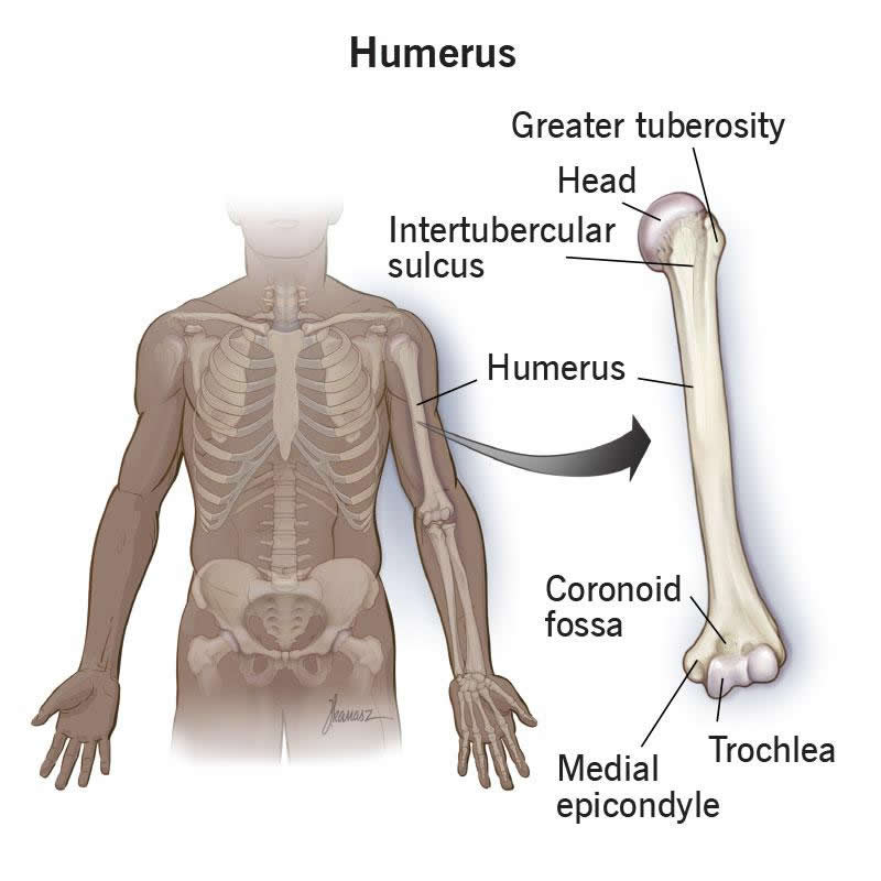Even though it’s one long bone, your humerus is made up of several parts. These include: